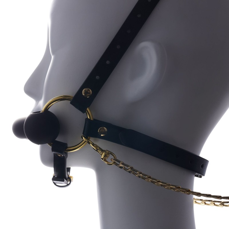 Wykonana z najwyższej jakości włoskiej skóry bydlęcej, ta uprząż szczyci się wyrafinowanym i elastycznym materiałem. Posiada wszechstronną, trójwymiarową, wielopoziomową regulację, umożliwiającą indywidualne dopasowanie do głowy, szyi i podbródka, aby dostosować się do różnych kształtów głowy. Wykonany z najwyższej jakości stopu cynku, posiada błyszczące złote wykończenie, które łączy trwałość z atrakcyjnym wyglądem. Zastosowany wysokiej jakości materiał silikonowy jest całkowicie bezpieczny i nadaje się do stosowania doustnego, zapewniając poczucie pewności.