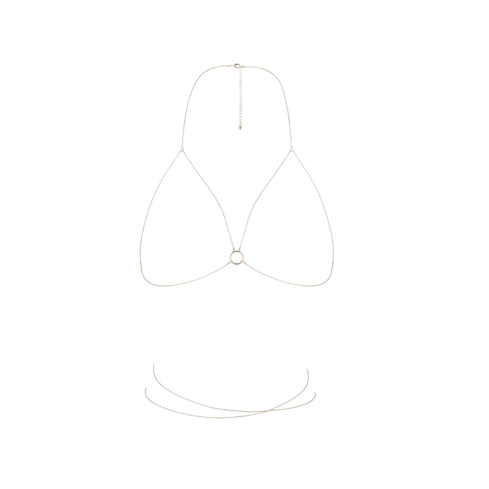 Zaprojektowany w formie delikatnego biustonosza z łańcuszków, otula ciało w sposób subtelny, ale niezwykle efektowny. Złote ogniwa połyskują przy każdym ruchu, przyciągając spojrzenia i dodając blasku każdej stylizacji. Możesz nosić go jako intymny dodatek do bielizny lub odważnie – na gołe ciało, pod marynarkę czy przezroczystą bluzkę. To idealny akcent, który podkreśla Twoją pewność siebie i styl.
