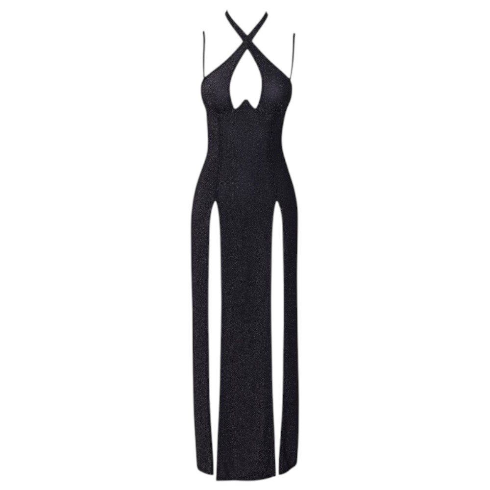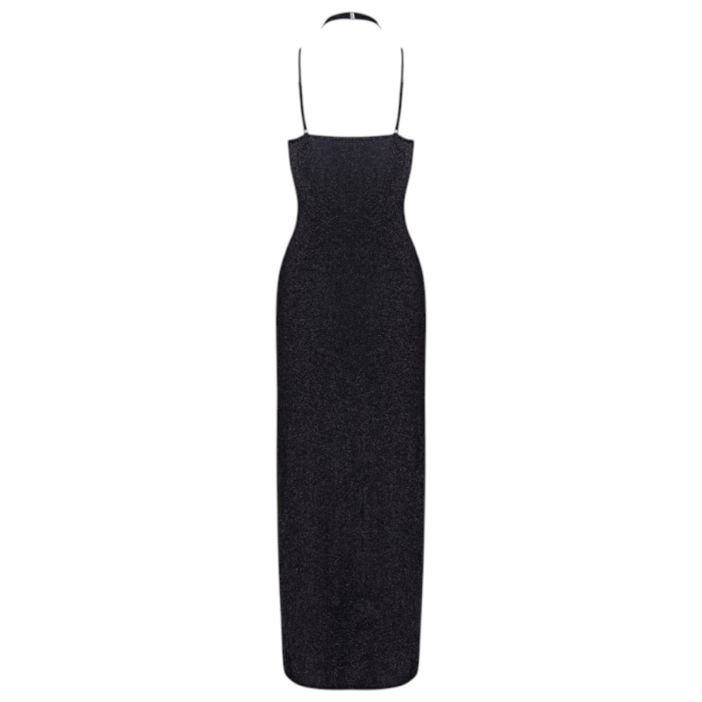 Plecy pozostają całkowicie odkryte, a błyszczące ramiączka można dowolnie odpinać, dostosowując kreację do okazji. Dwa wysokie rozcięcia z przodu spódnicy nadają sukni odważnego charakteru i zapewniają swobodę ruchów. Elastyczny, miękki materiał z połyskującym brokatem sprawia, że sukienka jest nie tylko efektowna, ale także wygodna podczas noszenia.