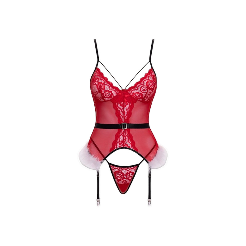 Rozpal atmosferę świąt w najbardziej zmysłowy sposób! Ten wyjątkowy komplet bielizny w czerwieni i koronce został zaprojektowany, aby dodać odważnego uroku każdej stylizacji intymnej. Subtelna koszulka z koronkowymi miseczkami, cienkimi ramiączkami i ozdobnym paskiem w talii podkreśla sylwetkę, a białe piórkowe wykończenia przy biodrach dodają całości figlarnego charakteru.