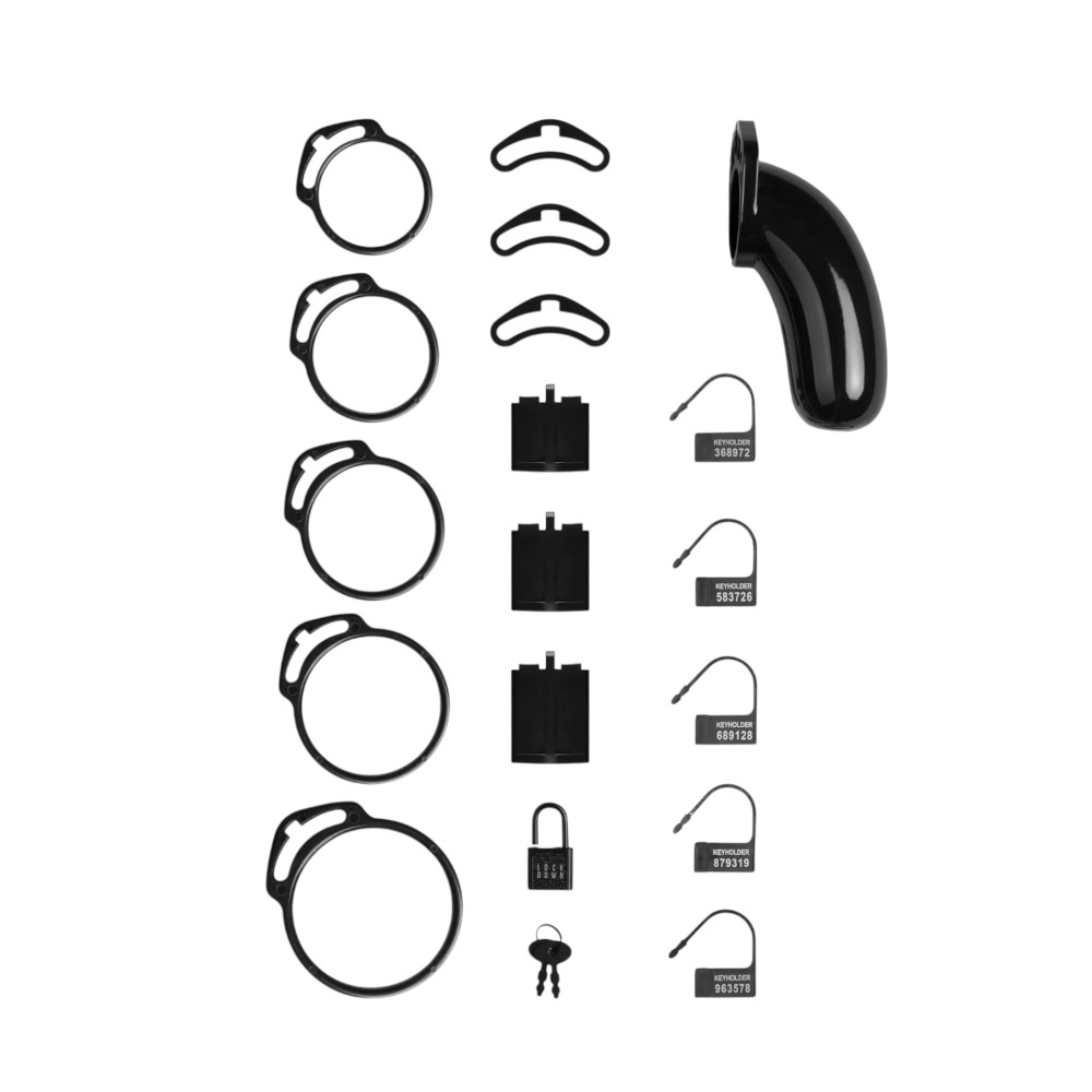 Cały zestaw zawiera 5 pierścieni w różnych rozmiarach dla idealnego dopasowania (4,5 – 6,5 cm). Zawiera również metalową kłódkę z 2 kluczami i 5 plastikowymi numerowanymi kłódkami. Plastikowe zamki można po użyciu odciąć nożyczkami. Unikalne numery na każdej kłódce zapewniają, że użytkownik nie może potajemnie wyjąć klatki czystości i założyć później nowej kłódki.