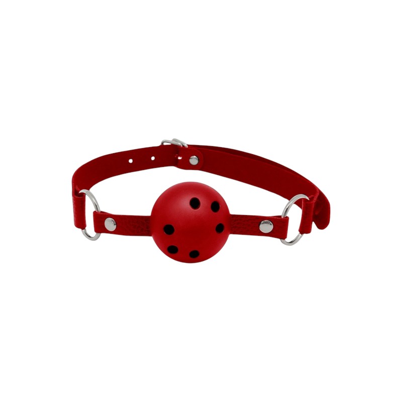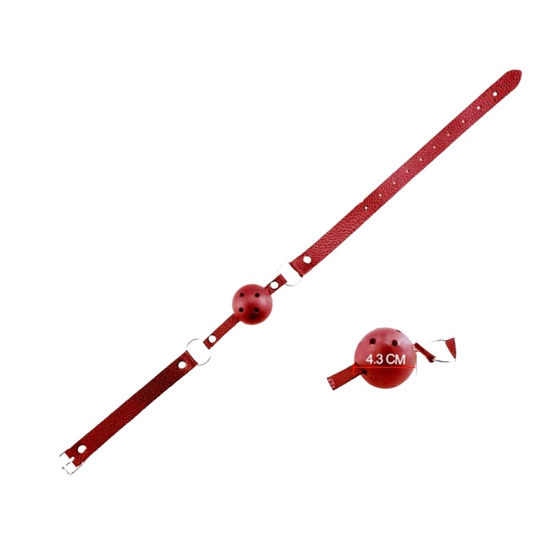 Czerwony knebel z otworami ułatwiającymi oddychanie, kulka ma średnicę 4,5 cm i jest wykonana ze sztywnego ABS, pasek jest regulowany od 40 do 72 cm.