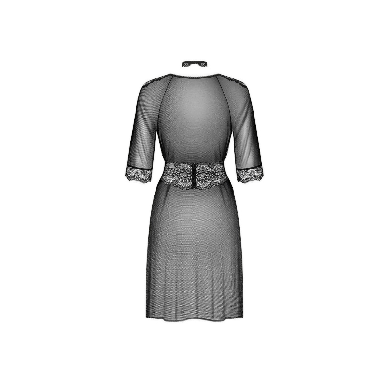Peniuar posiada koronkowy choker, który dodaje pikantnego, kobiecego stylu, oraz koronkowy pas z eleganckim wiązaniem, podkreślający talię i sylwetkę. Kuszące koronkowe wstawki na ramionach i rękawkach dodają całości uroku i elegancji. Uniwersalna długość sprawia, że jest idealny dla każdej figury.
