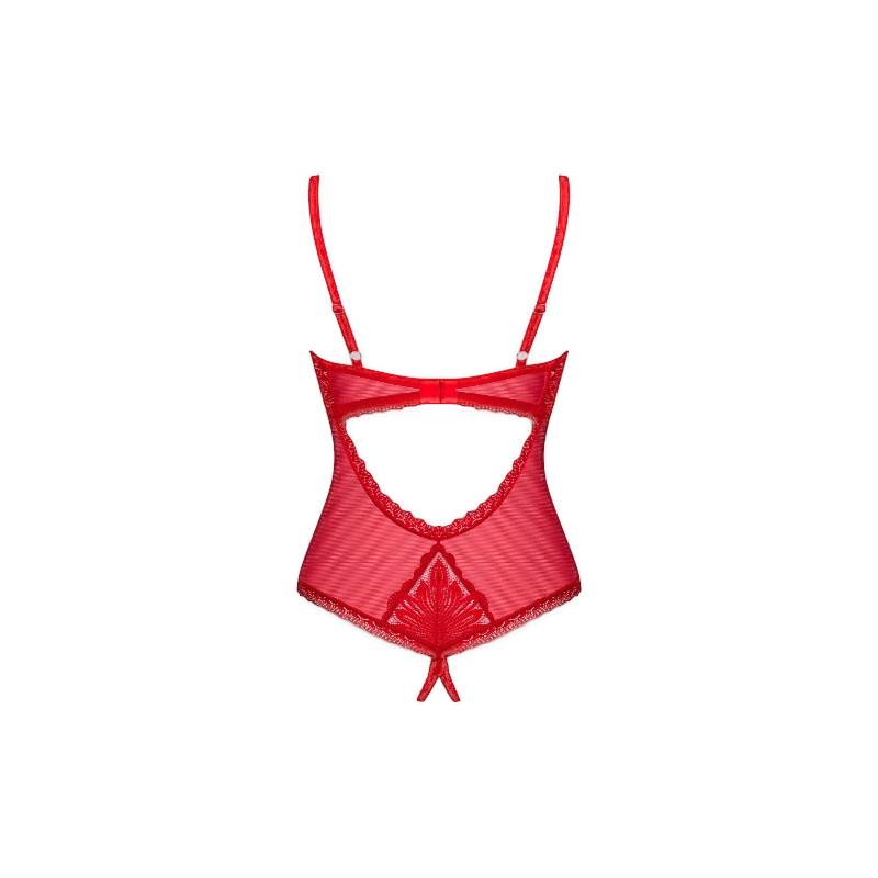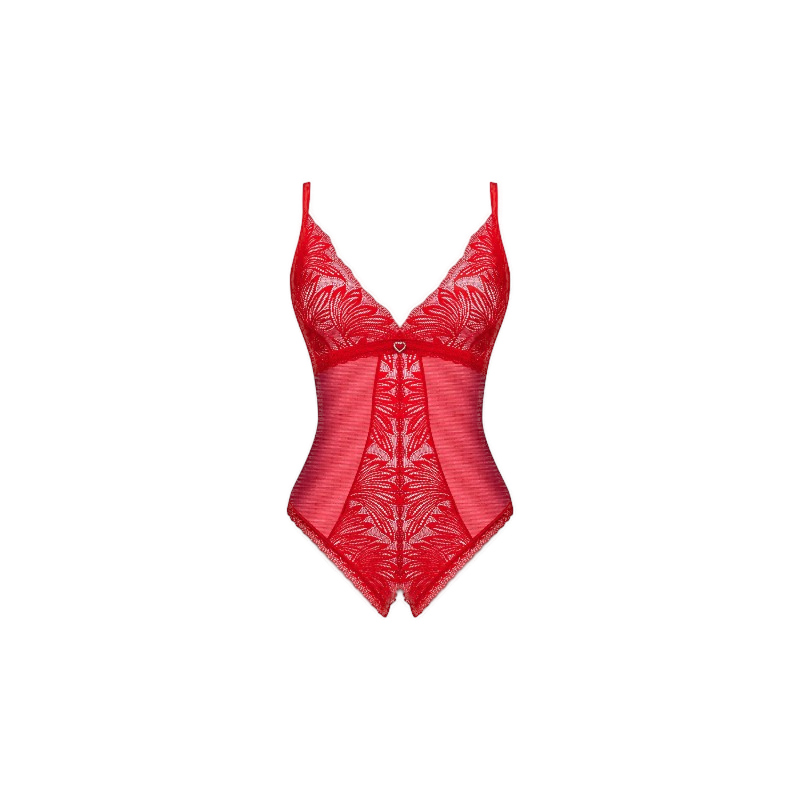 Zanurz się w świat namiętnych chwil, dzięki temu wyjątkowemu body w intensywnym odcieniu czerwieni. Otwarty krój i subtelne, koronkowe akcenty doskonale podkreślają Twoje wdzięki, zapewniając jednocześnie komfort noszenia. Regulowane ramiączka oraz kilkustopniowe zapięcie umożliwiają perfekcyjne dopasowanie, a srebrna zawieszka w kształcie serca przyciąga spojrzenia. To body to połączenie elegancji z erotyzmem, które pomoże Ci poczuć się pewnie i zmysłowo w każdej chwili.