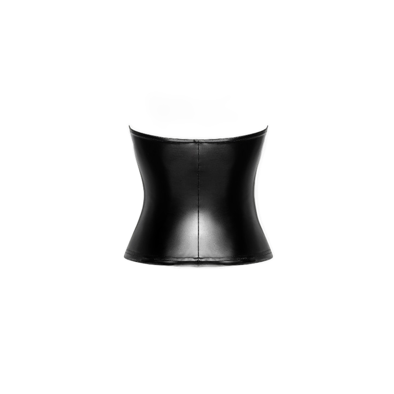 Elegancki i wyrazisty top w stylu gorsetu, który doskonale podkreśla sylwetkę. Wykonany z elastycznego, czarnego materiału o wet-lookowym wykończeniu, łączy w sobie nowoczesność i klasyczną zmysłowość. Z przodu posiada funkcjonalny, pełnowymiarowy zamek, który ułatwia zakładanie i zdejmowanie. Regulowane ramiączka można w każdej chwili odpiąć, dostosowując wygląd do swoich preferencji. Miękka, dopasowująca się tkanina zapewnia komfort noszenia i doskonałe dopasowanie.