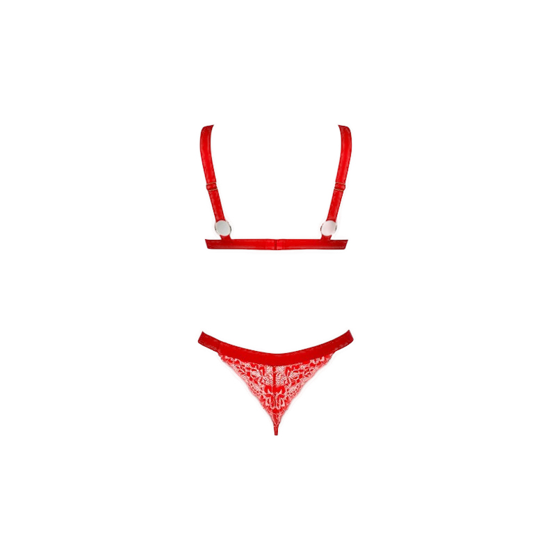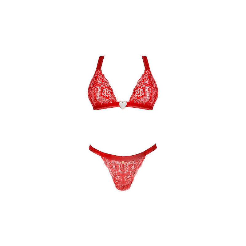 Uwodzicielski zestaw, który podkreśla kobiecość i dodaje pewności siebie. Czerwona bielizna, ozdobiona koronkowymi detalami i połyskującymi akcentami, to doskonały wybór na wyjątkowe chwile. Biustonosz z regulowanymi ramiączkami i kilkustopniowym zapięciem zapewnia idealne dopasowanie, a subtelne stringi dopełniają zmysłową całość. Złoty łącznik w kształcie serca to intrygujący detal, który przyciąga wzrok. Odkryj wyjątkową elegancję i komfort w jednym zestawie.