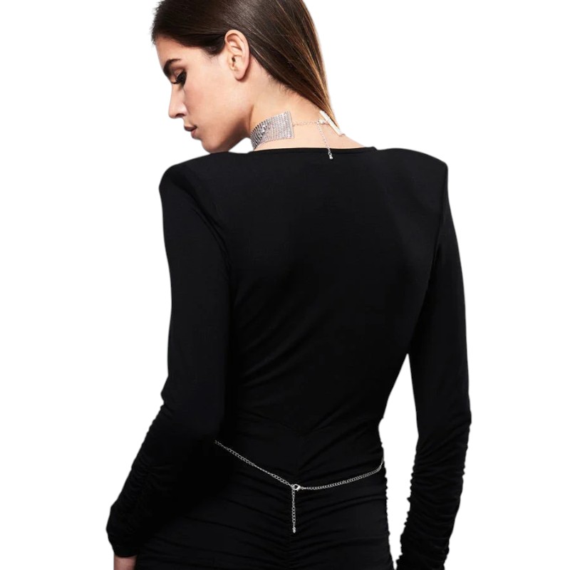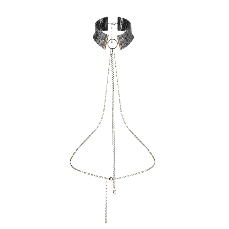 Obroża dopasowuje się do szyi, otulając ją chłodnym metalem, podczas gdy długi, oplatający tułów łańcuszek podkreśla linię ciała i dodaje zmysłowej oprawy każdemu ruchowi. Możesz nosić ją jako stylowy dodatek lub wykorzystać w intymnych chwilach, pozwalając partnerowi przejąć kontrolę.