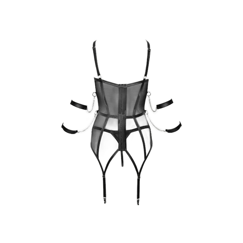 Ciesz się niezwykłym wyglądem bondage dzięki temu zestawowi, który łączy zmysłowość i funkcjonalność. Gorset i stringi wykonane są z elastycznego materiału powernet z paskami w stylu bondage i matowymi akcentami. Metalowe elementy w kolorze srebra dodają charakteru. Dołączone są 4 regulowane kajdanki na ręce/ramiona, które można łatwo przypiąć do bocznych pierścieni za pomocą łańcuszków z karabińczykami. Regulowane paski przy dekolcie, na gorsecie oraz paski do pończoch zapewniają idealne dopasowanie. Gorset zapinany z tyłu na haftki oraz wyposażony w napy na szyi dla dodatkowego komfortu.