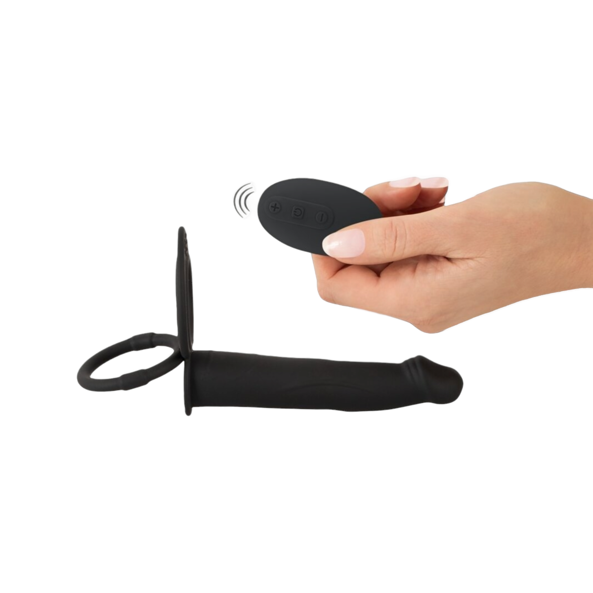 Podwójny dildo na pilota jest również wyposażony w (drugi) wibro-penis do podwójnego pchnięcia. Smukły, lekki wibrator analny jest mocno przymocowany do połączonego pierścienia na penisa i jądra. Pierścienie są po prostu nasuwane na penisa i jądra i utrzymują wibrator mocno i bezpiecznie na miejscu. Pierścienie wspierają również erekcję dzięki ciasnemu dopasowaniu.
