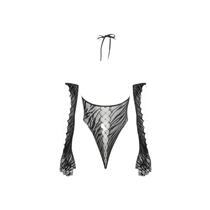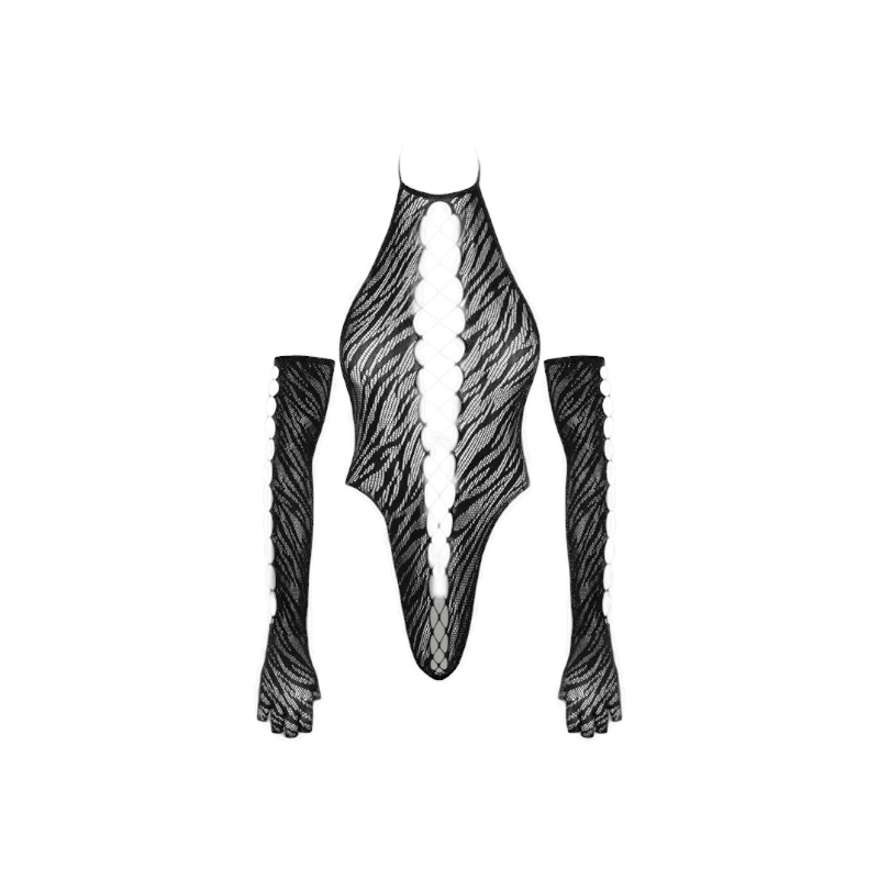 Czarny, przezroczysty komplet od Cottelli FANTASY, składający się z body na ramiączkach i długich rękawiczek. Wykonany z delikatnego materiału typu mesh z wplecionymi tygrysimi paskami. Na rękawach i przodzie body znajdują się wstawki z grubo plecionej siateczki. Całość jest miękka i elastyczna, zapewniając wysoki komfort noszenia. Body z wyciętymi plecami, elastycznym zapięciem na szyi typu halterneck oraz wyjątkowo wysokimi wycięciami na nogi. Długie rękawiczki są pozbawione końcówek na palce, co dodaje im wyjątkowego charakteru.