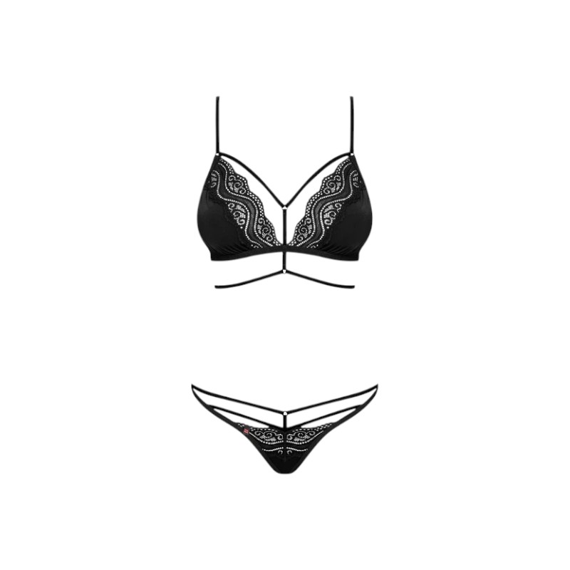 Czerń, koronka i paseczki – klasyka w zmysłowym wydaniu. Ten komplet to połączenie gładkiego materiału i misternej koronki bez zbędnych usztywnień, dlatego wygląda obłędnie i nosi się jeszcze lepiej. Biustonosz z regulowanymi ramiączkami i wygodnym zapięciem zapewnia dopasowanie, a elastyczne paseczki z przodu podkreślają dekolt. Do kompletu – stringi, które eksponują wszystko, co najpiękniejsze.