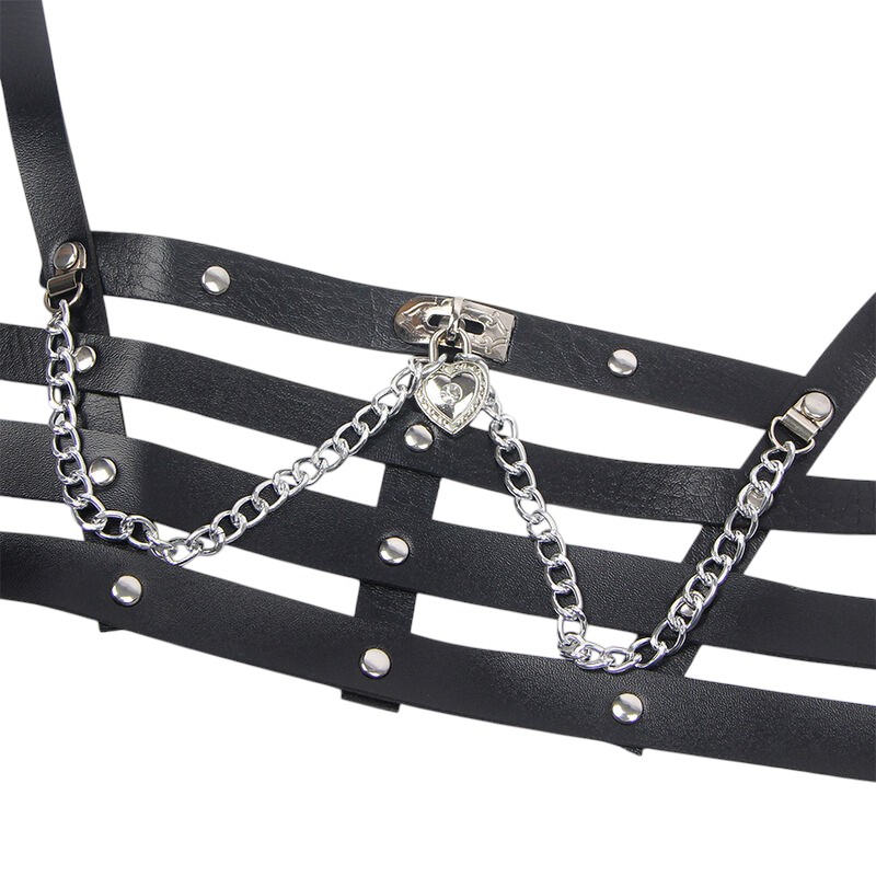 Stylowy i odważny skórzany harness dla kobiet, który podkreśla zmysłowość i dodaje charakteru każdej stylizacji. Doskonale prezentuje się zarówno na odzieży, jak i bezpośrednio na skórze, subtelnie eksponując biust i sylwetkę. Wykonany z wytrzymałej, 2-centymetrowej taśmy z wysokiej jakości skóry syntetycznej oraz ozdobiony metalowymi łańcuchami, zapewnia nie tylko efektowny wygląd, ale i komfort użytkowania.