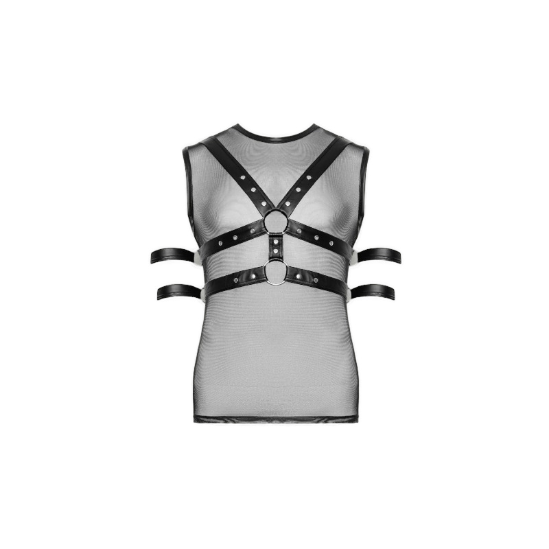 Stylowy, męski zestaw, który łączy atrakcyjność z odrobiną dominacji! Komplet składa się z bezrękawowej koszulki, uprzęży na klatkę piersiową oraz 4 regulowanych opasek na nadgarstki i ramiona, które można przypiąć do pierścieni na uprzęży. Przód koszulki wykonany jest z delikatnej siateczki powernet, podczas gdy tył wyróżnia się matowym wykończeniem. Koszulka jest elastyczna, miękka i wygodna, zapewniając komfort noszenia. Uprząż z regulowanymi paskami w matowym wykończeniu idealnie podkreśla męską sylwetkę, a pierścienie na klatce piersiowej i brzuchu umożliwiają kreatywną zabawę z dołączonymi opaskami. Zapięcia na rzepy sprawiają, że opaski są łatwe w użyciu i zapewniają idealne dopasowanie