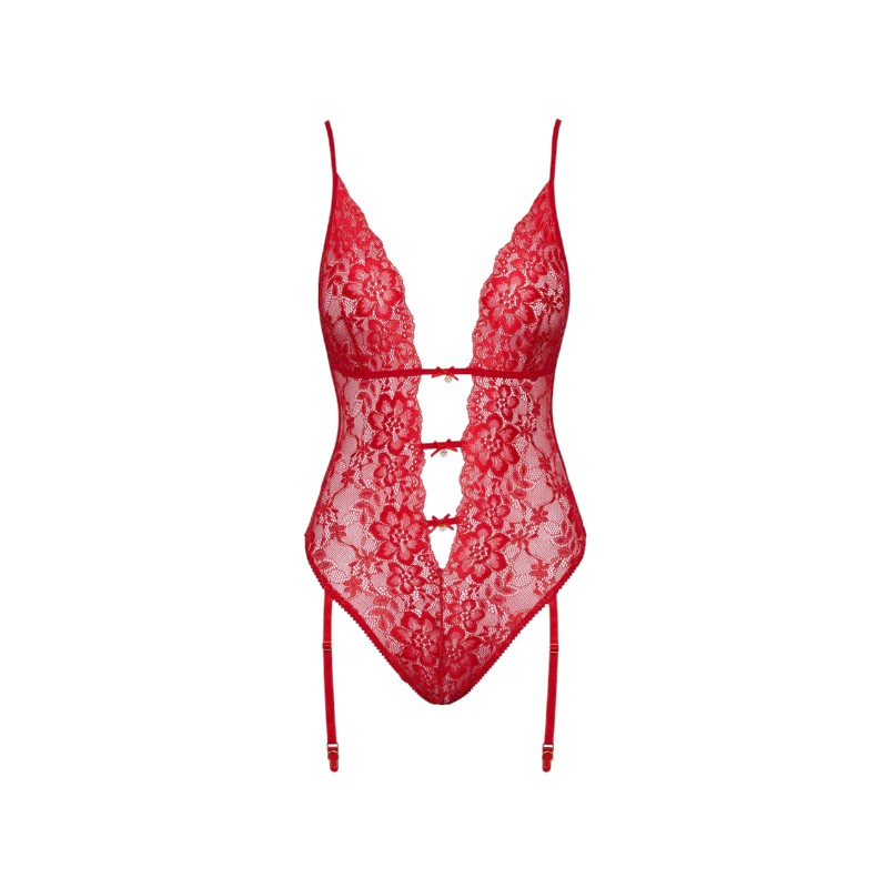 Uwodzicielskie body w stylu pasów do pończoch, w całości wykonane z delikatnej, czerwonej koronki ozdobionej złotymi detalami. Wyjątkowo miękkie i elastyczne, gwarantuje maksymalny komfort noszenia. Głęboki dekolt aż do talii, z trzema paskami ozdobionymi kokardkami i błyszczącymi kamieniami, dodaje zmysłowego charakteru. Tył w stylu dwuczęściowym (biustonosz i majtki z pasami do pończoch) zachwyca swoją finezją. Regulowane ramiączka i paski do pończoch zapewniają idealne dopasowanie do sylwetki.