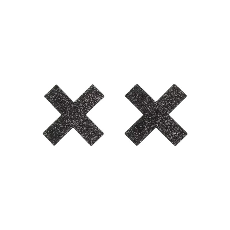 Czarne, brokatowe naklejki na sutki w kształcie litery X. Naklejki są miękkie i giętkie, dzięki czemu idealnie dopasowują się do biustu.Aby użyć, po prostu oderwij folię od spodu i przyłóż lepką stroną do skóry.
