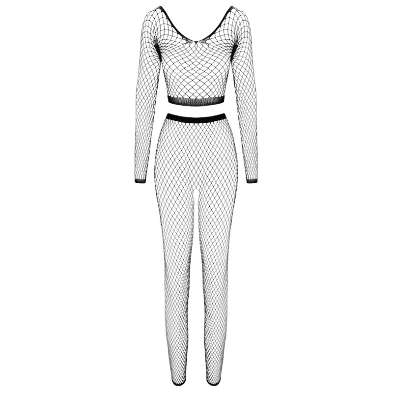 Ten czarny, dwuczęściowy zestaw wykonany z siateczki to idealny wybór dla osób, które chcą podkreślić swoją zmysłową stronę. Krótki top z długimi rękawami pięknie akcentuje sylwetkę, a otwarta leginsowa część dodaje pikanterii i odwagi. Miękki, elastyczny materiał siateczkowy nie tylko świetnie wygląda, ale także przyjemnie otula ciało, gwarantując wygodę i komfort noszenia. Idealny zarówno na wyjątkowe okazje, jak i na wieczory, gdy chcesz poczuć się wyjątkowo.
