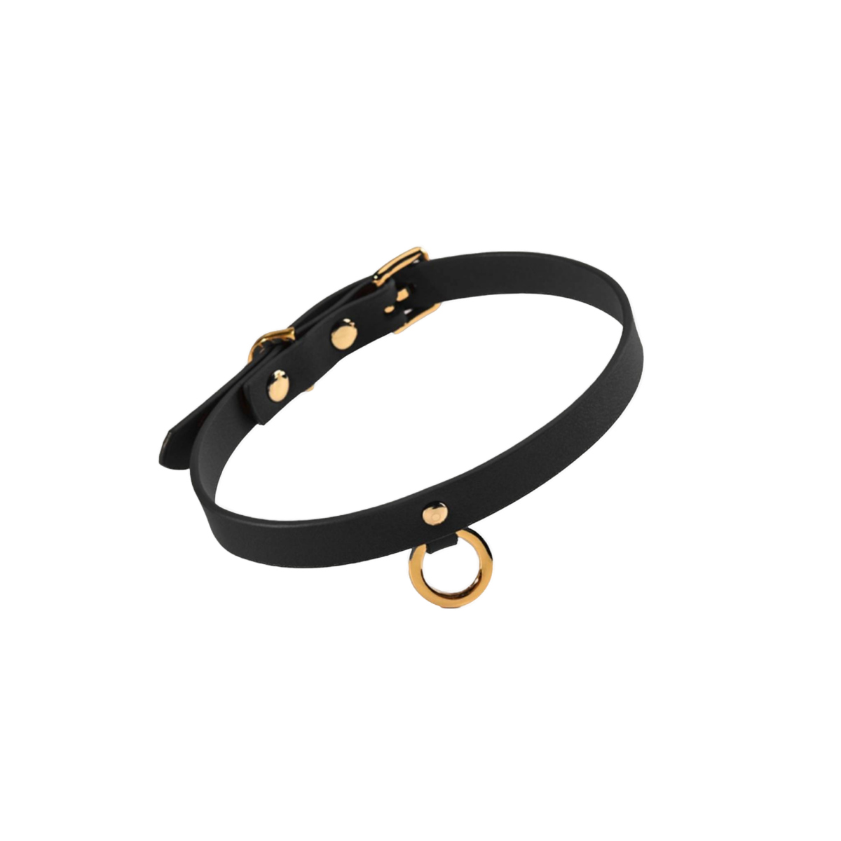 Choker posiada złote kółeczko, umożliwiające podpięcie smyczy.