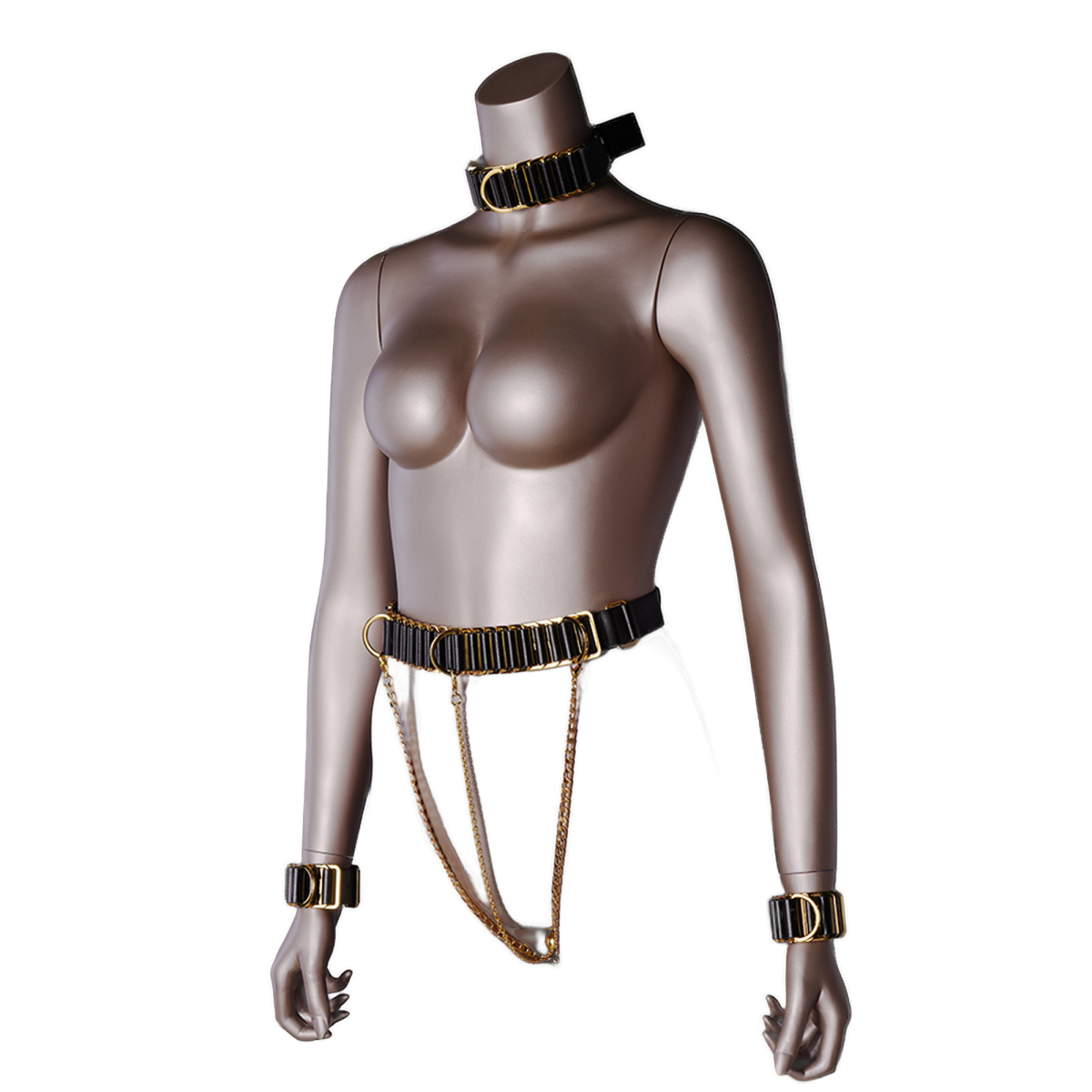 Erotyczny pas, do którego przymocowane są dwa łańcuszki z karabińczykami, które można odpiąć i użyć do zablokowania rąk do tyłu, na bok lub do przodu. Aby w pełni korzystać z funkcjonalności tego gadżetu erotycznego sugerujemy dokupić obróżkę i kajdanki.