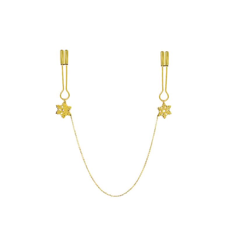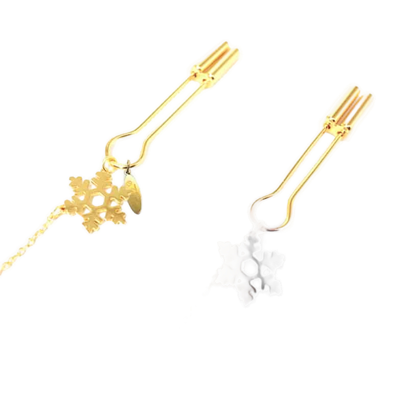 Eleganckie klamerki na sutki w kolorze złotym, z łańcuszkiem i zawieszkami w kształcie płatka śniegu.