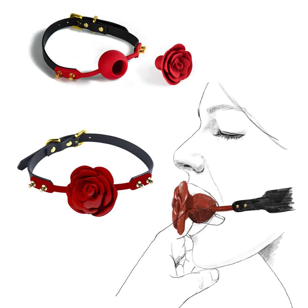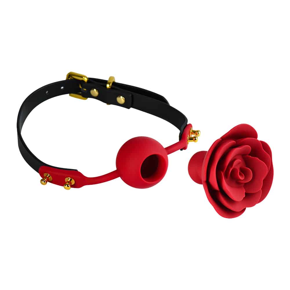 Knebel w kształcie róży wykonany z najwyższej jakości silikonu medycznego, ze skórzanym, regulowanym paskiem i złotymi elementami ozdobnymi.