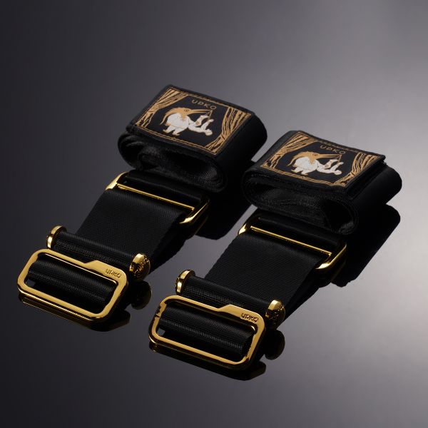 Pasy przytrzymujące zrobione są z wysokiej jakości nylonu. Mankiety na kostki wykonane są z miękkiego, ale mocnego aksamitu. Mocne i wytrzymałe, czarno-złote paski do wiązania są łatwe w użyciu, ponieważ można regulować ich długość i napięcie. Elegancie wykończenie pięknymi metalowymi elementami nadaje luksusowy wygląd. Wszystkie części są galwanizowane.