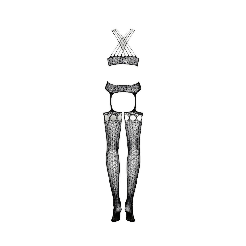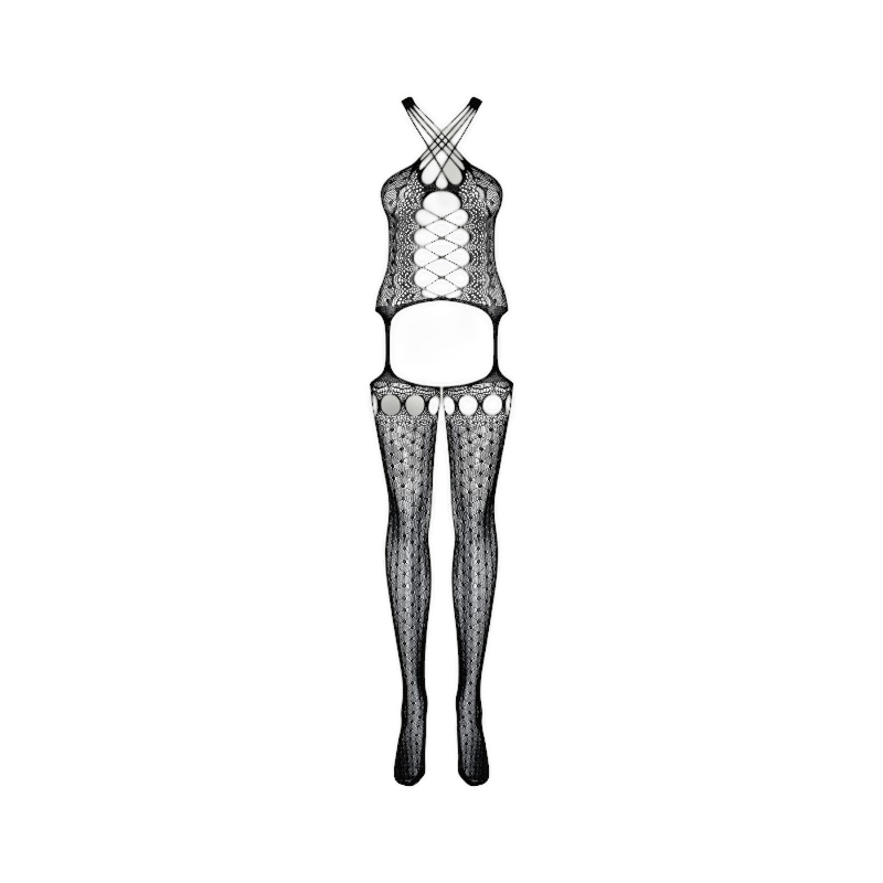 Zmysłowy bodystocking, które doskonale podkreśli Twoje krągłości i przyciągnie spojrzenia. Połączenie delikatnego topu z pończochami, ozdobione geometrycznym motywem, dodaje elegancji i odważnego charakteru. Pionowe wycięcia na talii oraz skrzyżowane paski na plecach pięknie modelują sylwetkę. Idealny wybór na wieczory pełne pasji i uwodzicielskiego uroku.