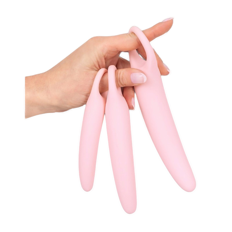Zestaw trzech dild o różnych rozmiarach i wadze, zaprojektowany do stopniowego treningu mięśni dna miednicy i delikatnego rozciągania. Każdy element ma wygodny uchwyt w formie pierścienia, dzięki czemu użytkowanie jest bezpieczne i komfortowe. Powierzchnia soft touch sprawia, że dilda są przyjemne w dotyku, a lekko zakrzywiona forma i wąska końcówka umożliwiają łagodne wprowadzenie i zwiększenie komfortu ćwiczeń.