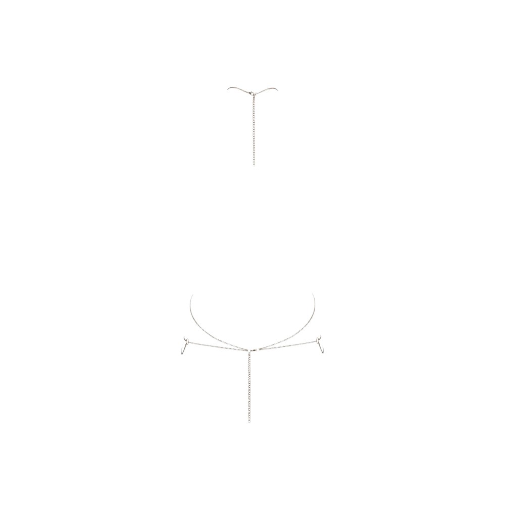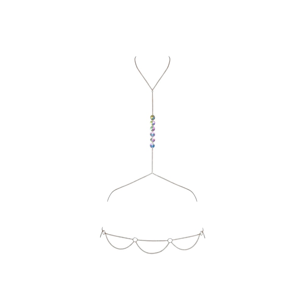 Ekskluzywny łańcuszek na ciało w złotym kolorze, zdobiony sześcioma dużymi, migoczącymi kryształami holograficznymi umieszczonymi między piersiami. Delikatne łańcuszki obejmują szyję, biust, talię i biodra, tworząc efektowną, zmysłową kompozycję. Regulowane zapięcia zapewniają perfekcyjne dopasowanie, a subtelne dekoracje i pierścienie dodają całości luksusowego charakteru. Można nosić go samodzielnie na nagim ciele lub jako elegancki dodatek do strojów kąpielowych i dopasowanych kreacji.