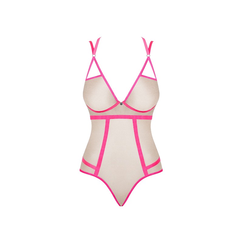 Zmysłowe body w odcieniu nude z kontrastującymi różowymi paseczkami to idealne połączenie subtelności i odwagi. Miękki, przyjemny w dotyku materiał dopasowuje się do sylwetki, podkreślając jej atuty. Regulowane ramiączka oraz zapięcie na haftki na plecach zapewniają wygodę noszenia i idealne dopasowanie. Body prezentuje się wyjątkowo efektownie, dodając pewności siebie i zmysłowego charakteru każdej stylizacji – zarówno tej na wieczór, jak i do codziennego uwodzenia.